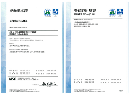 • 岳南建設は品質に関する国際規格ISO9001を取得致しております