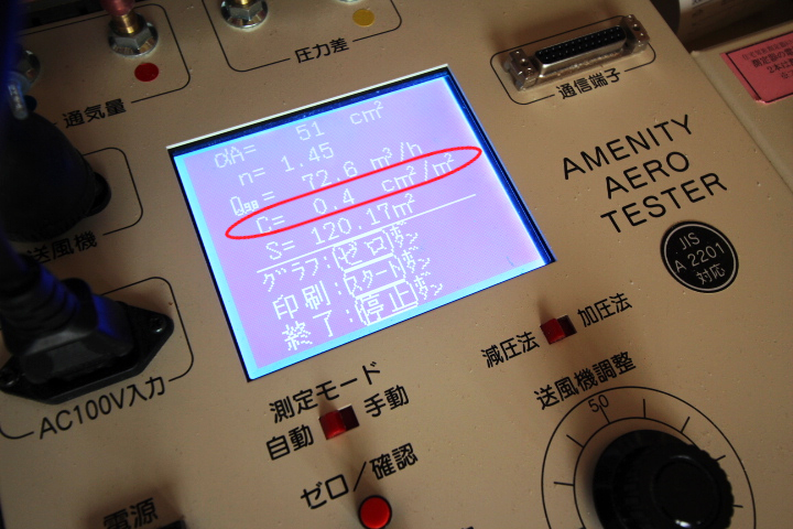 気密測定検査の結果は、C値(相当隙間面積)=0.4㎠/㎡