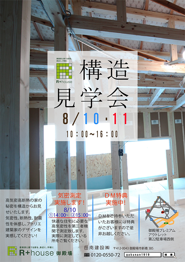 この度、御殿場市東田中にて構造見学会を開催致します。R+houseの特徴でもある高気密高断熱の高性能住宅をどのように施工しているのか、その裏付けとなる気密測定検査も行います。また来場特典もご用意しておりますので、是非お気軽にお越しください。詳しくはチラシをご覧ください。