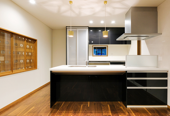 キッチンのペンダントライトの反射もオシャレに仕上がりました。