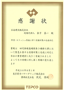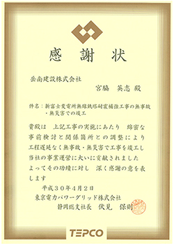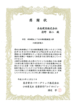 • 東京電力パワーグリッド株式会社より各工事の感謝状表彰がありましたのでお知らせいたします。