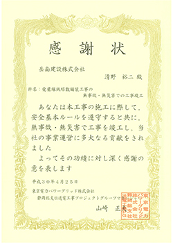 感謝状  無災害竣工