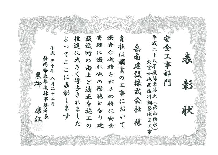 東部農林事務所長表彰で安全工事部門1件、沼津土木事務所長表彰で優良技術者表彰と地域貢献表彰の2件が表彰されました。