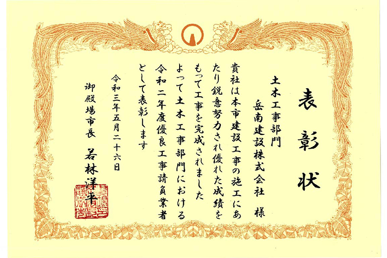 御殿場市の優良工事表彰において岳南建設が表彰されました