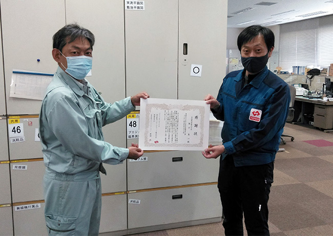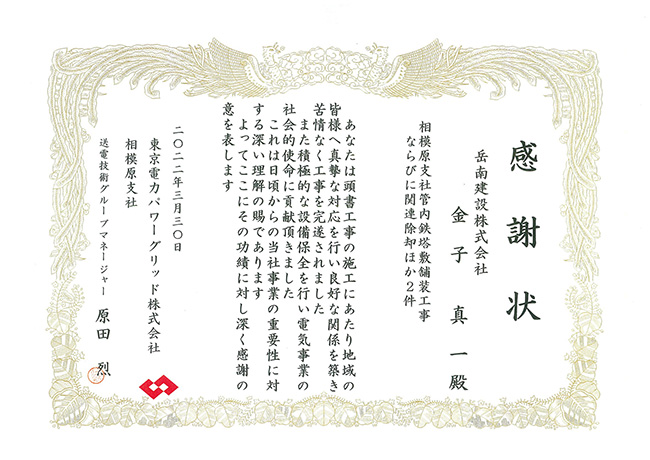 東京電力パワーグリッド株式会社相模原支社送電技術グループ様より、相模原支社管内鉄塔敷舗装工事他2件について、当社現場代理人へ感謝状をいただきました。