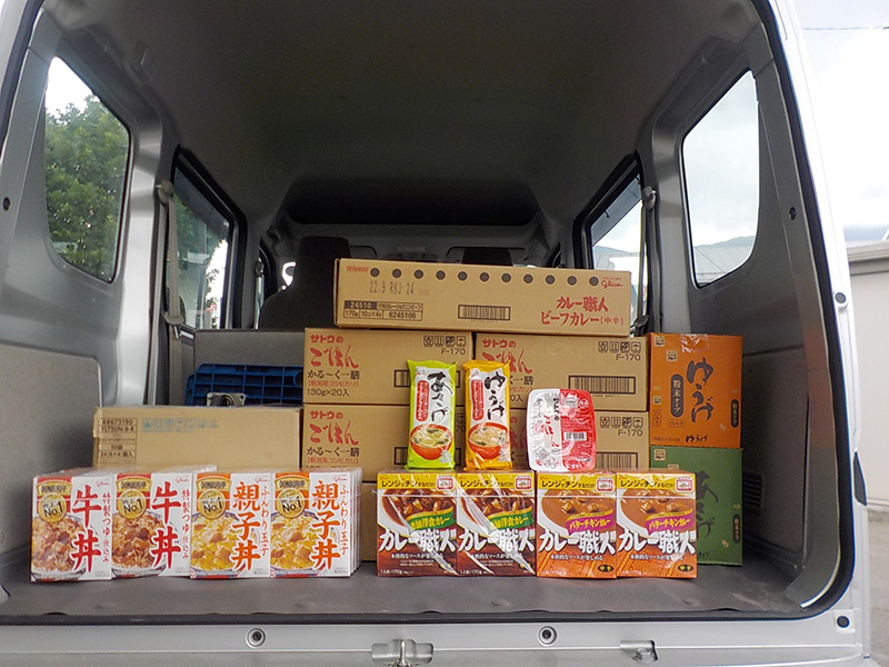 今回当社は備蓄してありました食料のレトルト食品180食、ご飯120食分を寄付致しました。