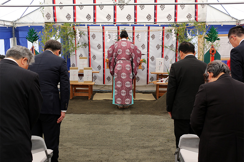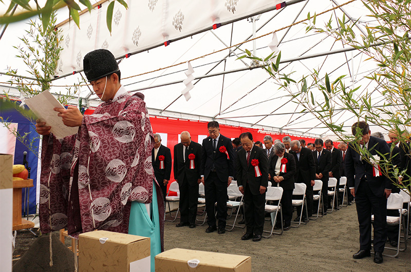 神官による厳かな祝詞奏上、玉串奉奠の儀が滞りなく進行され、工事の始まりを地域一丸となって寿ぎました。